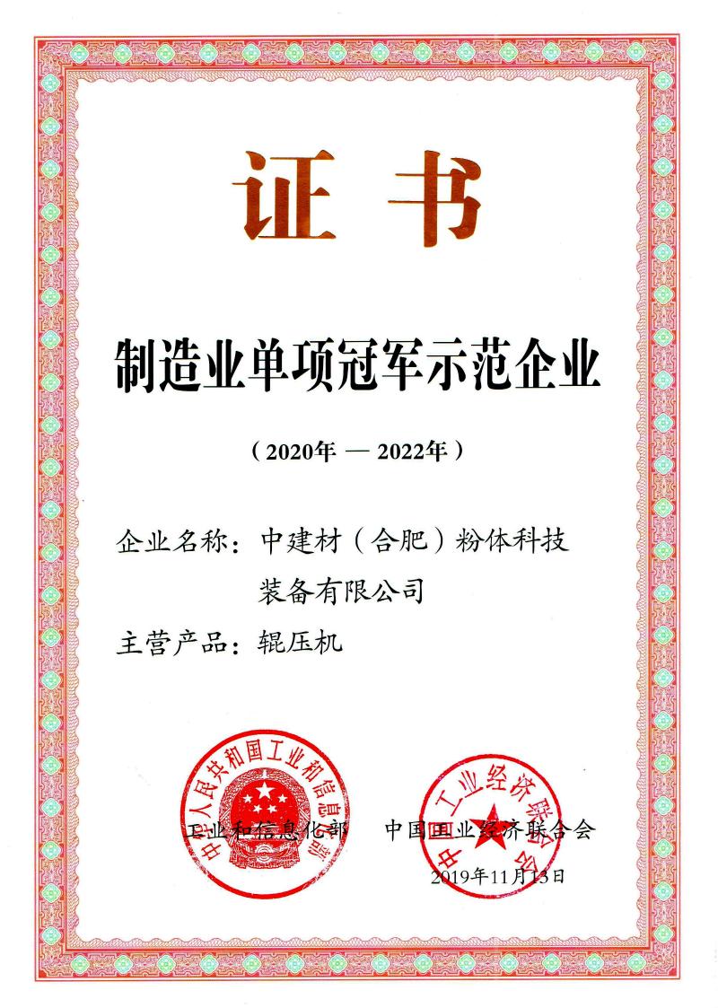 中建材(合肥)粉體科技裝備有限公司前身為合肥水泥研究設(shè)計(jì)院粉磨研究所,2011年8月,經(jīng)合肥水泥研究設(shè)計(jì)院粉體工程公司與肥西節(jié)能設(shè)備廠聯(lián)合改制組建而成,國(guó)家高新技術(shù)企業(yè),全國(guó)首批“制造業(yè)單項(xiàng)冠軍示范企業(yè)”,中國(guó)建材集團(tuán)“六星企業(yè)”。